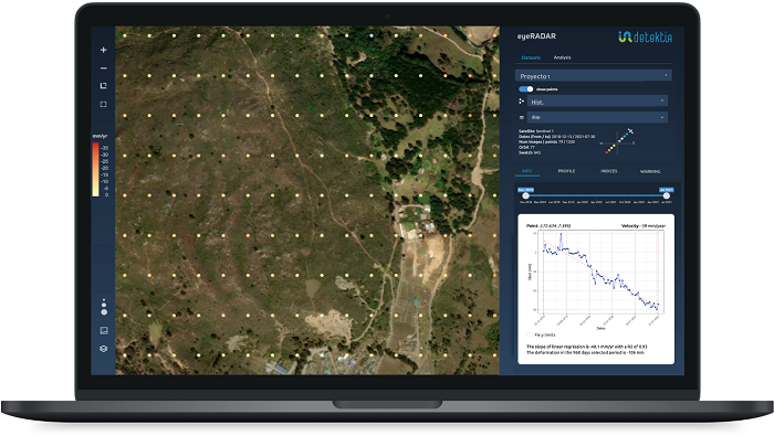 Las series temporales de deformación generadas a partir de radar satelital se cargan sobre la plataforma EyeRADAR de Detektia donde se analiza punto por punto, agrupada por ladera, o asociada a cada zona crítica identificada por el equipo de proyecto.