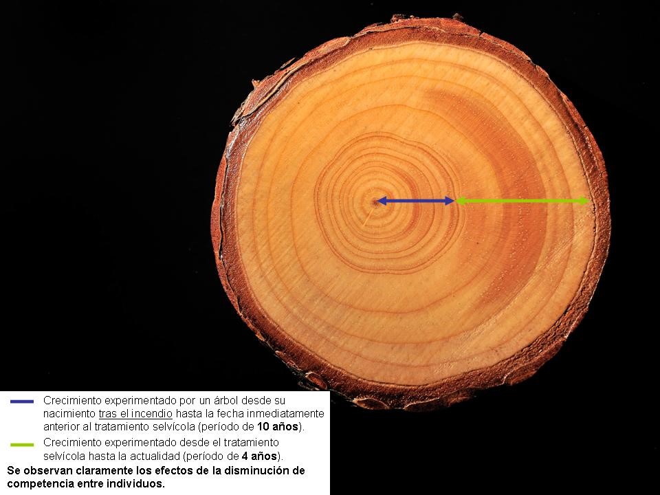Cada anillo representa el crecimiento del árbol en un año. La flecha azul indica el crecimiento que el árbol obtuvo durante los 10 primeros años de vida. La estrechez de los anillos indica que la masa arbórea creció en una espesura tal que los nutrientes del suelo no daban para alimentar a tanto árbol, y los árboles crecen delgaduchos y debiluchos, y tarde o temprano muchos enfermarán o morirán ante la falta de alimento, atrayendo a la plaga y al incendio.
