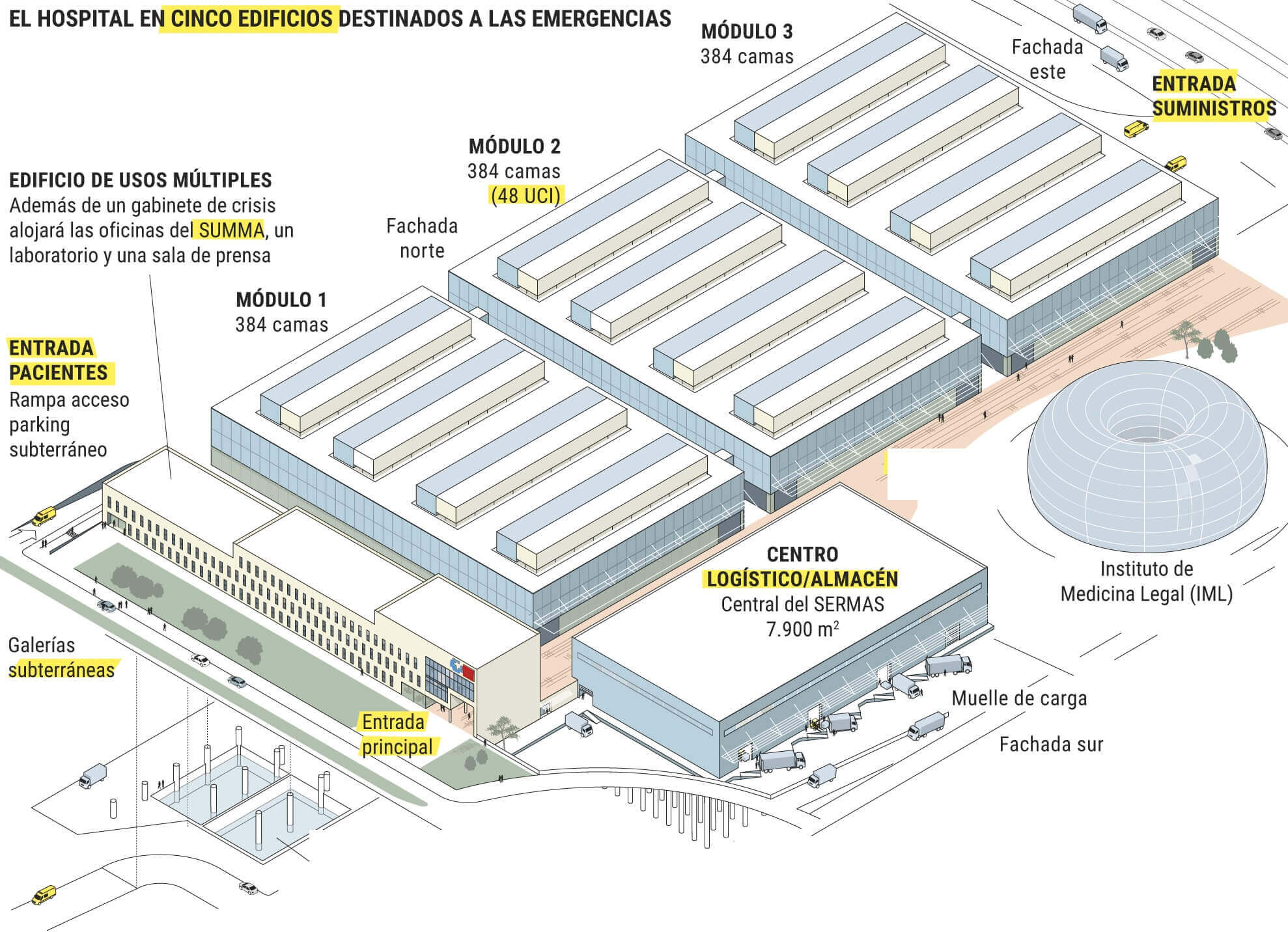 Otro ejemplo es el mayor hospital de emergencias construido en España durante la pandemia en 2020, el Isabel Zendal de Madrid (en la imagen), en el que Sacyr ha participado en su construcción. En esta infraestructura se han empleado varios de los conceptos de arquitectura modular.