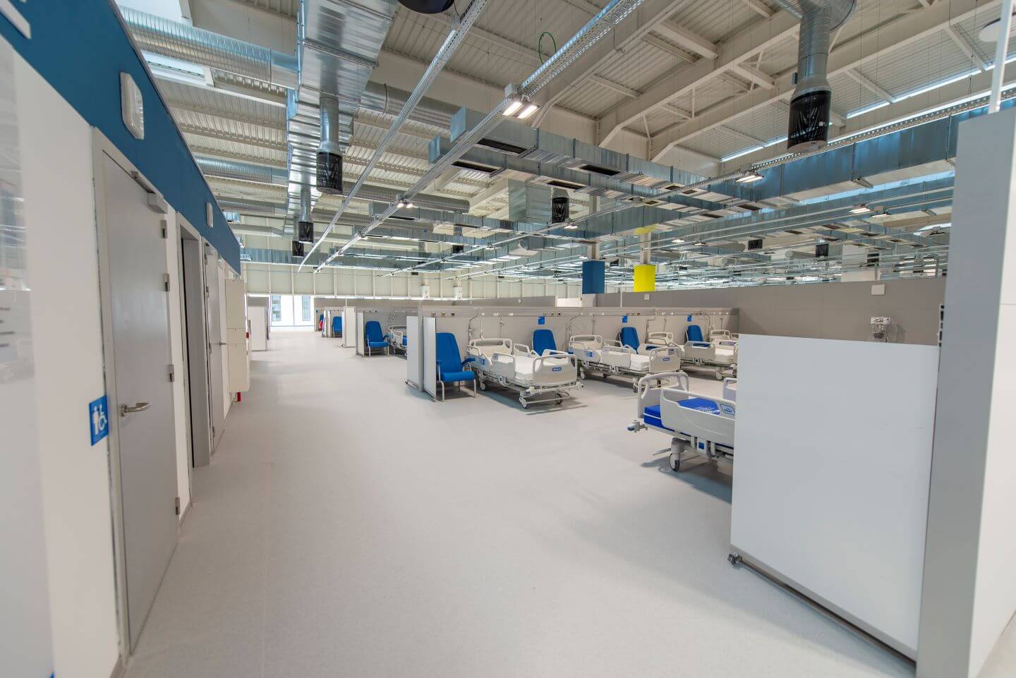 Sacyr ha participado en la construcción del mayor Hospital de Emergencias construido en España durante la pandemia del 2020. Nos referimos al Hospital Isabel Zendal de Madrid, que da servicio a 1.152 camas, 48 puestos UCI, y tiene más de 80.000 m2 construidos. En esta infraestructura se han empleado varios de los conceptos que hemos indicado. El Hospital esta organizado en pabellones sectorizables desde el punto de vista de instalaciones y modulación, que permiten habilitar únicamente la parte necesaria. Además el diseño modular le permite que pueda ser capaz de adaptarse a otros planes funcionales en un futuro.