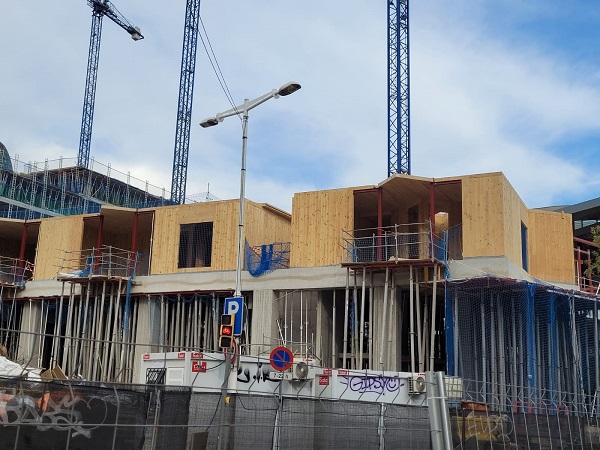 En Barcelona, Sacyr Ingeniería e Infraestructuras está construyendo un edificio de madera, en un complejo de cuatro edificios de 238 viviendas públicas para alquiler y venta.