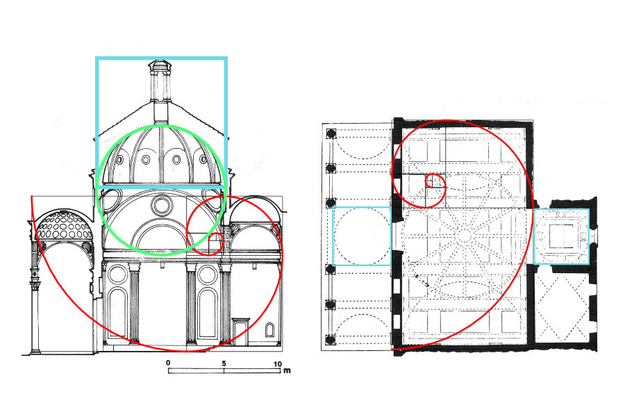 Superposición de la proporción áurea sobre la planta y la fachada de la Capilla Pazzi. Crédito: Wikimedia / Elaboración propia