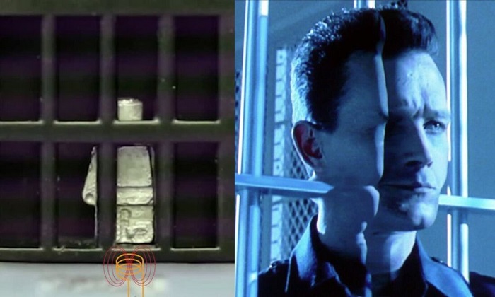 El robot es capaz de escapar de una pequeña jaula al cambiar a estado líquido. Crédito: The Independent.