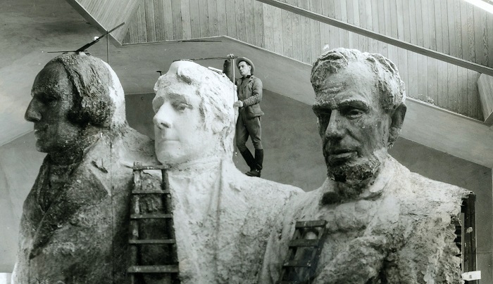 Lincoln Borglum, hijo de Gutzon Borglum, junto a un modelo en yeso a escala del monumento. Crédito: Charles D'Emery / NPS.