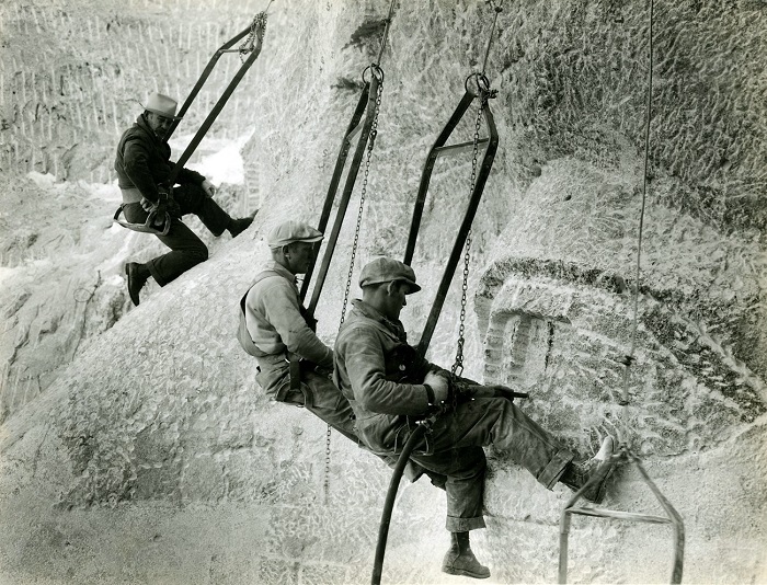 Los trabajadores enfrentaban condiciones extremas: desde un calor abrasador hasta un frío glacial y fuertes vientos. Cada día, subían 700 escalones hasta la cima de la montaña para fichar y luego descendían por la pared en una "silla de contramaestre" sostenida por cables de acero. El trabajo era “emocionante pero peligroso”. Así lo indica el NPS, que destaca que el 90% de la montaña se esculpió con dinamita.