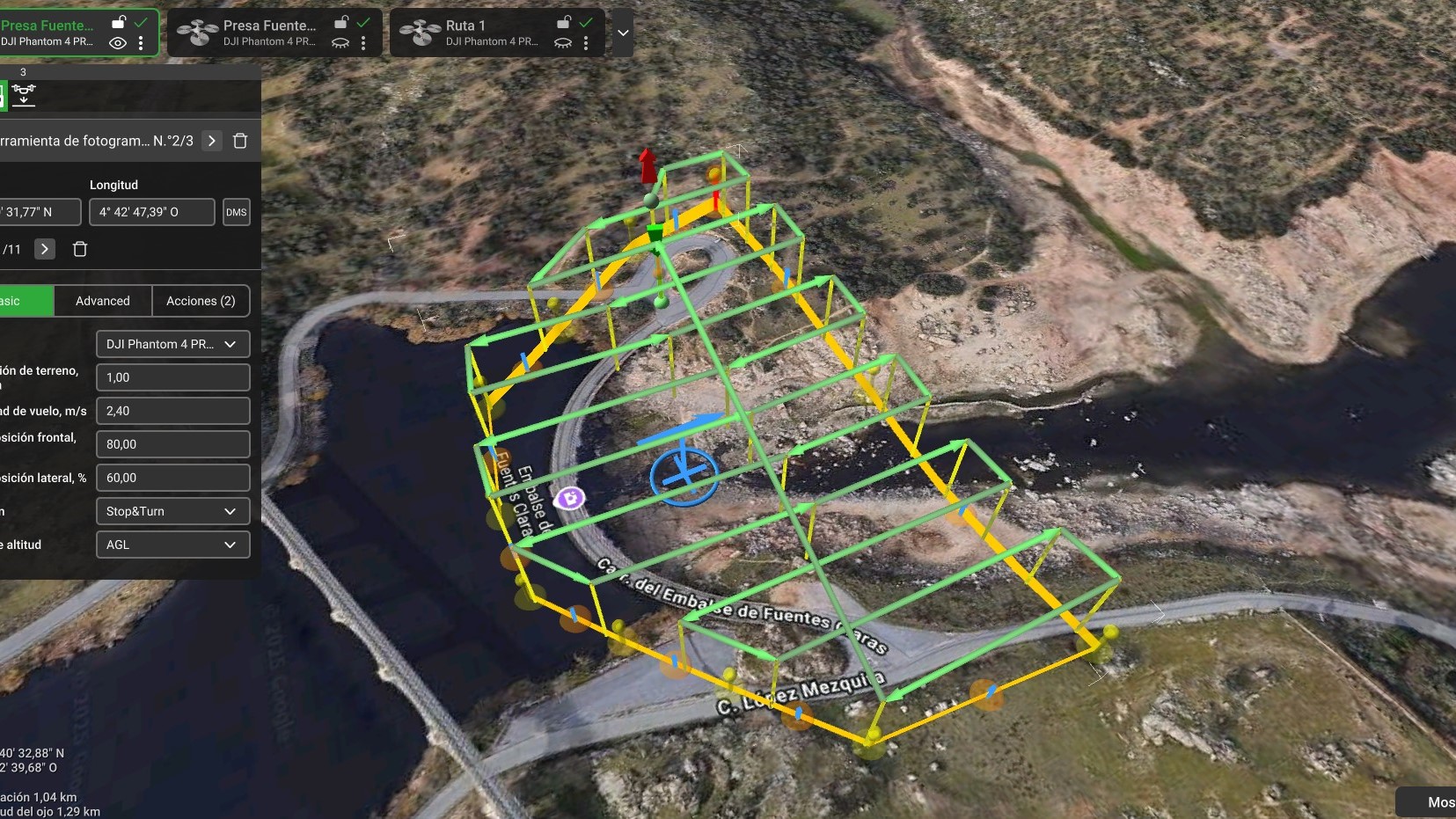 “Marcamos la zona que queremos que el dron sobrevuele y va a haciendo fotos cenitales a lo largo de todo el recorrido, barriendo la extensión de la presa. Así se consiguen modelos digitales en los que se pueden medir con parámetros reales de distancias”, explica Gabriel Palacios, técnico de Prevención y responsable de Operaciones con Drones en Sacyr.