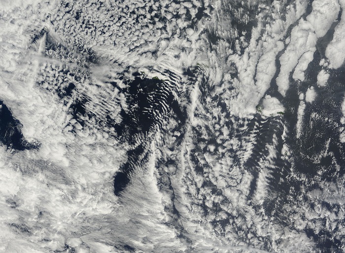 En las imágenes de satélite, algunos océanos están cubiertos por franjas blancas de nubes que corresponden a las rutas de navegación. Crédito: NASA.
