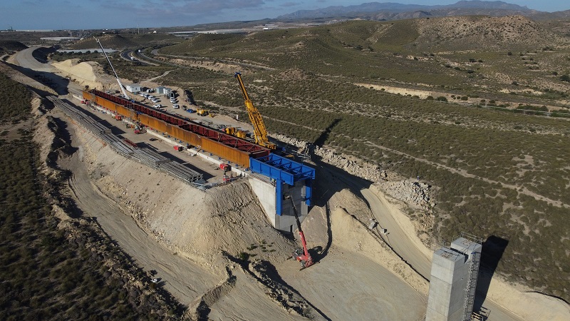 Este viaducto sobre el cauce seco de una rambla mide 906 metros y tiene una luz máxima de 67 entre sus 17 vanos. Su construcción acaba de cumplir un hito significativo: se ha realizado el empuje de las primeras seis dovelas, con un avance de 153 metros.