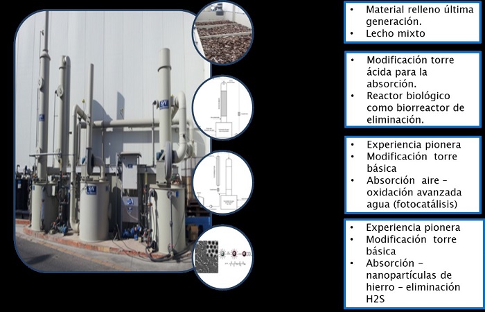 - Bioscrubber: Combinación de dos tecnologías: la absorción de los compuestos olorosos en fase acuosa y la oxidación de éstos mediante el uso de microorganismos.