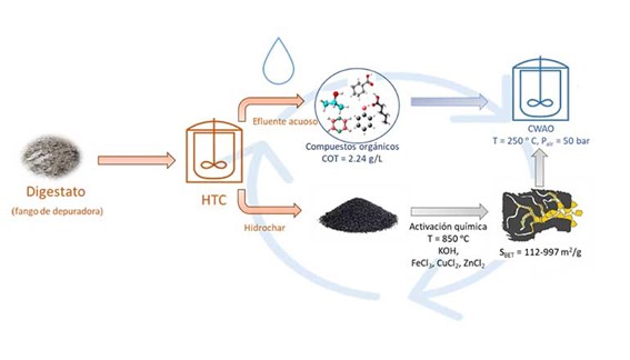 El digestato se transforma en biocarbón (hidrochar en inglés) a través de la carbonización hidrotermal.